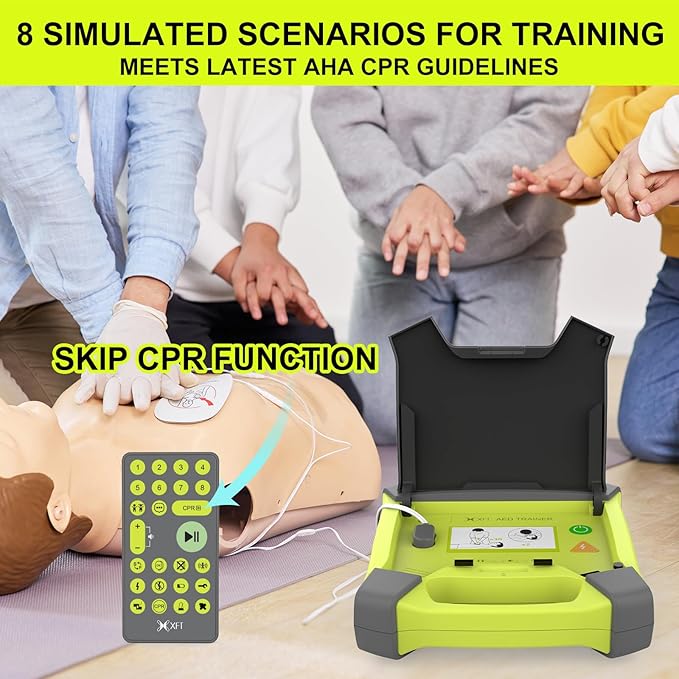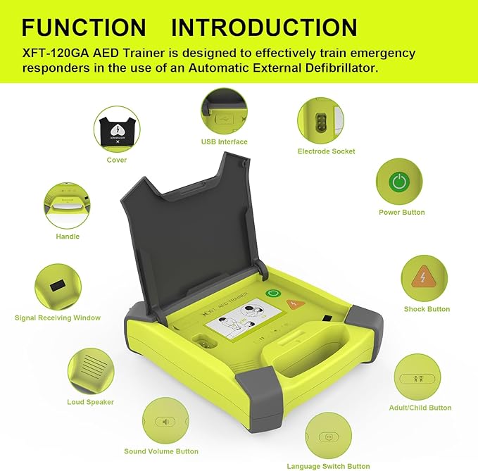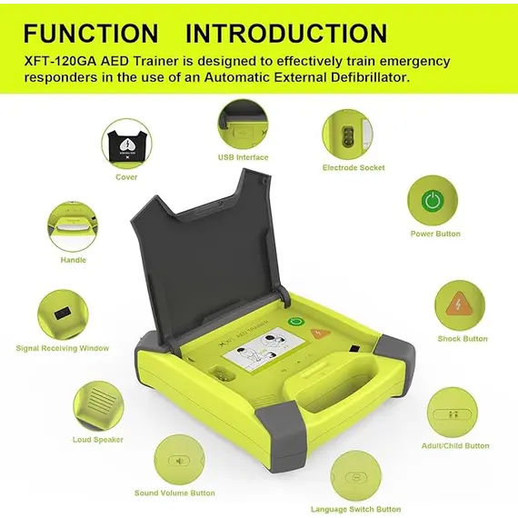 Ο εκπαιδευτικός απινιδωτής XFT-120GA είναι μια ρεαλιστική, ασφαλής και πλήρης συσκευή εκπαίδευσης για την προσομοίωση χρήσης Αυτόματου Εξωτερικού Απινιδωτή (AED), ιδανική για σεμινάρια Α’ Βοηθειών, Εκπαιδευτές, Επαγγελματίες Υγείας και σχολικά προγράμματα. Προσομοιώνει πλήρως πραγματικές λειτουργίες χωρίς επικίνδυνο ρεύμα υψηλής τάσης.