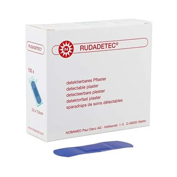 Τα μπλε επιθέματα τραυμάτων Rudadetec είναι ειδικά σχεδιασμένα για ασφαλή κάλυψη μικρών τραυμάτων σε περιβάλλοντα υψηλών απαιτήσεων υγιεινής, όπως η βιομηχανία τροφίμων, προσφέροντας ανίχνευση και προστασία.