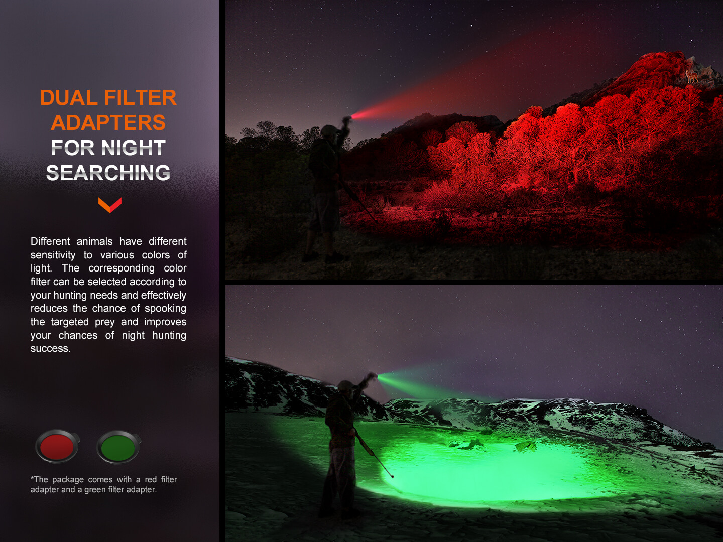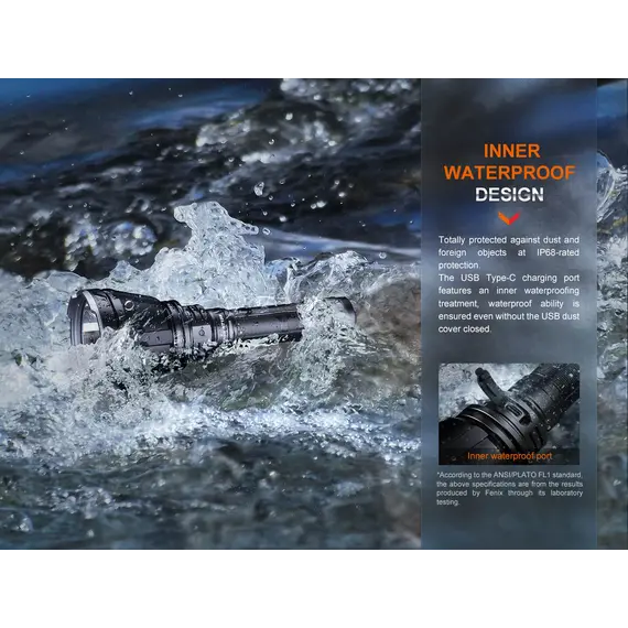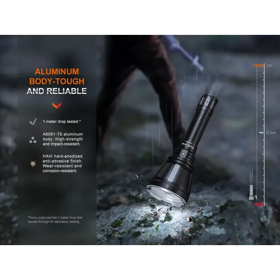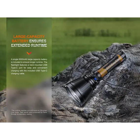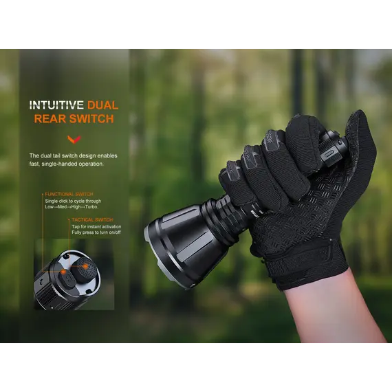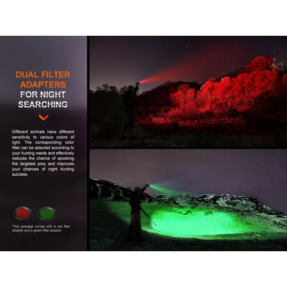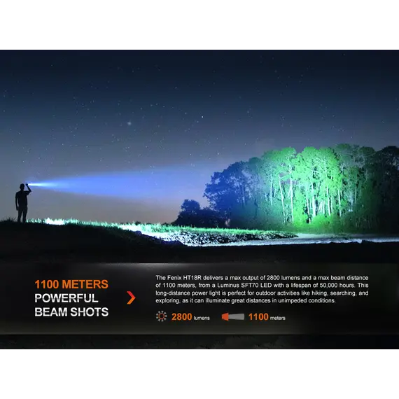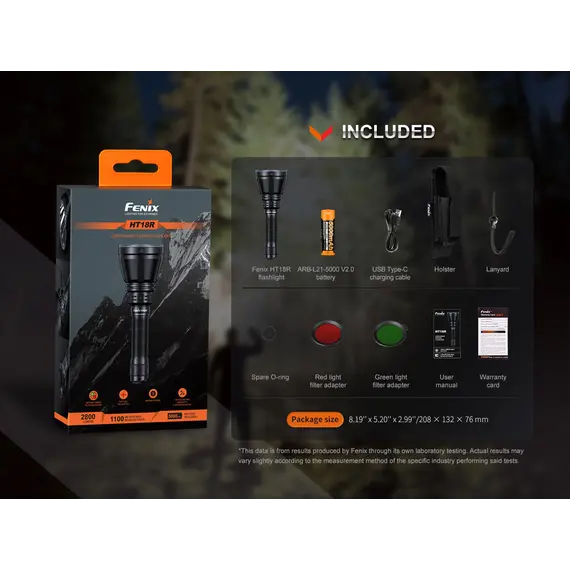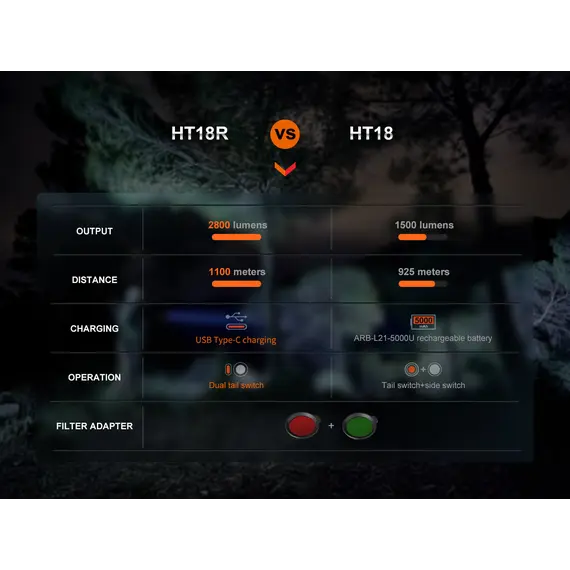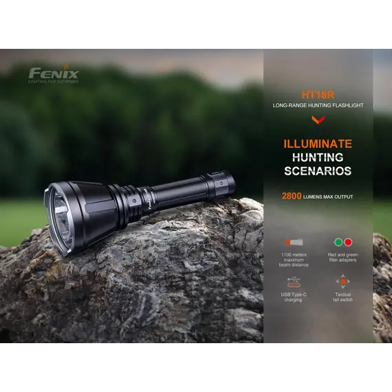 Fenix HT18R Επαναφορτιζόμενος με USB +ALG-18+AER-05 Ο Φακός Fenix HT18R είναι ένας φακός μεγάλων αποστάσεων πολλαπλών χρήσεων που διαθέτει απίστευτη απόδοση εκτοξεύοντας μέγιστο 2800 lumens και απόσταση δέσμης έως και 1100 μέτρα. Είναι εφοδιασμένος με διπλούς ουραίους διακόπτες με τους οποίους ενεργοποιούνται και όλες τις λειτουργίες φωτισμού, συμπεριλαμβανομένων των SOS σε περίπτωση έκτακτης ανάγκης. Επιλέξετε εύκολα και γρήγορα ανάμεσα σε έξι λειτουργίες φωτισμού, χρησιμοποιώντας τον διπλό επιχειρησιακό ουραίου διακόπτη. Ο Φακός Fenix HT18R είναι ανθεκτικός στις κρούσεις και αδιάβροχος (IP68), όλα τα παραπάνω χαρακτηριστικά καθιστούν τον Φακό HT18R ιδανικό για χρήση απο κυνηγούς και διασώστες. Η συμπεριλαμβανόμενη μπαταρία ιόντων λιθίου 5000 mAh μπορεί να φορτιστεί άνετα μέσω της θύρας USB Type-C του φακού, καθιστώντας τον φακό Fenix HT18R το ιδανικό εργαλείο για επιχειρησιακή απόδοση υψηλής έντασης και μεγάλης διάρκειας. Ο φακός Fenix HT18R συνοδεύετε από 2 φίλτρα ένα κόκκινο και ένα πράσινο.