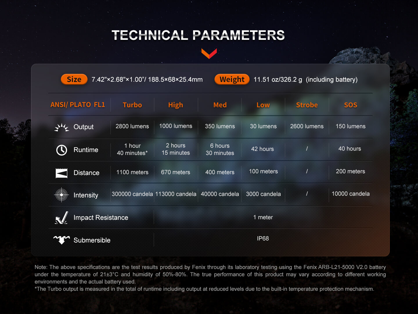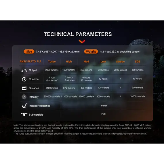 Λειτουργίες Φωτισμού: 5 επίπεδα φωτεινότητας, Στροβιλισμός Τύπος λαμπτήρα: Luminus SFT70 LED Μέγεθος: Μήκος 188,5mm, Κεφαλή 6,8mm, Κορμός 25,4mm