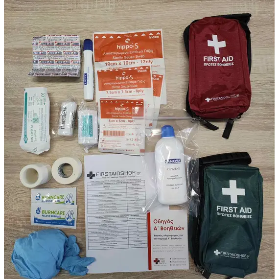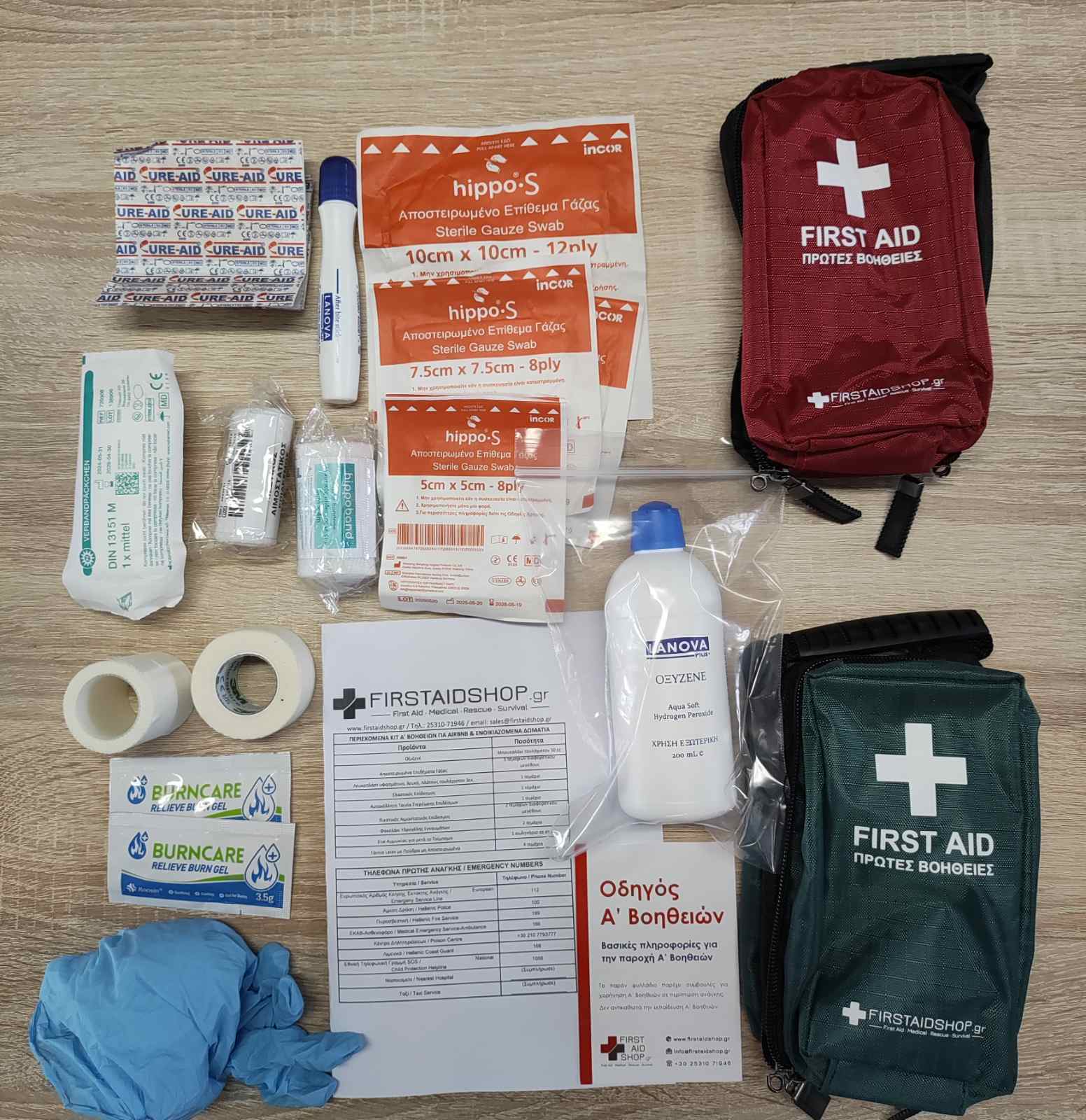 Σε τσαντάκι FAS-500 με την ένδειξη "FIRST AID" και "ΠΡΩΤΕΣ ΒΟΗΘΕΙΕΣ" όπως ακριβώς προβλέπεται από την σχετική εγκύκλιο. Επιλέξαμε το τσαντάκι αντί για το κουτί καθώς υπάρχει καλύτερη κατανομή περιεχομένου ανάλογα με την χρήση και δεν σκορπάνε τα είδη όταν ανοίγει γιατί βρίσκονται σε εσωτερικά χωρίσματα που κλείνουν με φερμουάρ ή λάστιχο.