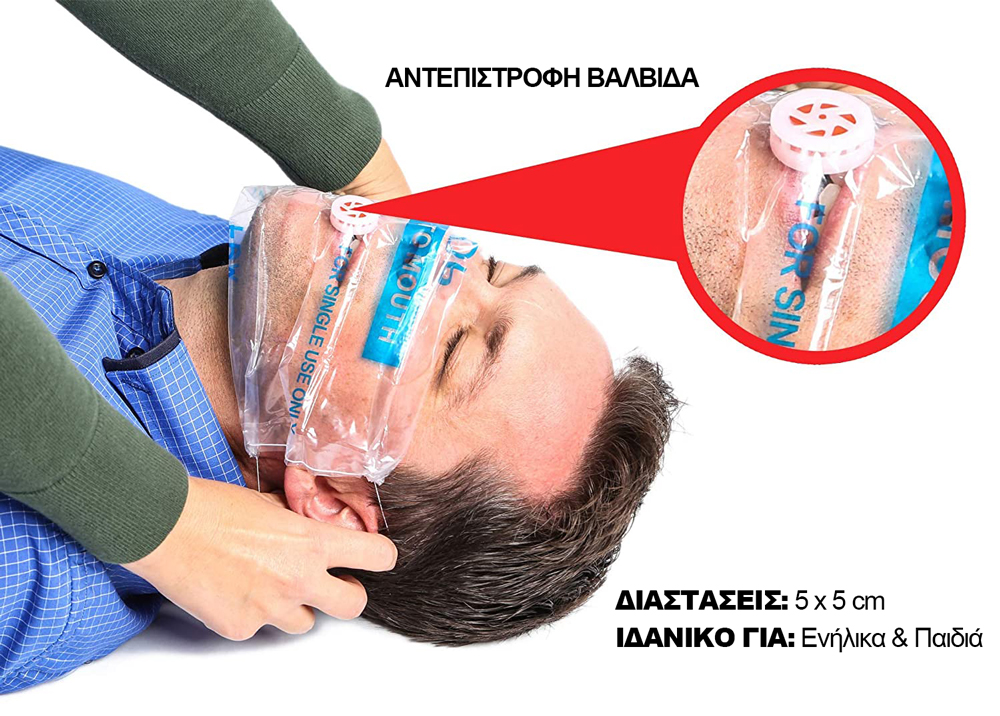 • Ημιδιαφανής μάσκα με ανεπίστροφη βαλβίδα για αποφυγή άμεσης επαφής με το στόμα, τη μύτη και το πρόσωπο του θύματος.