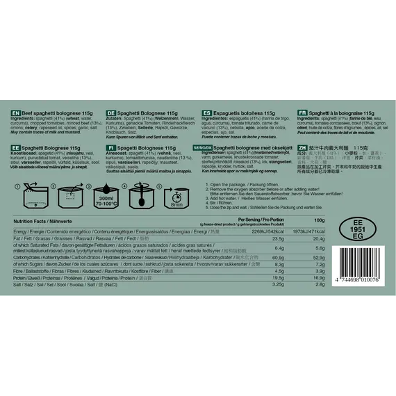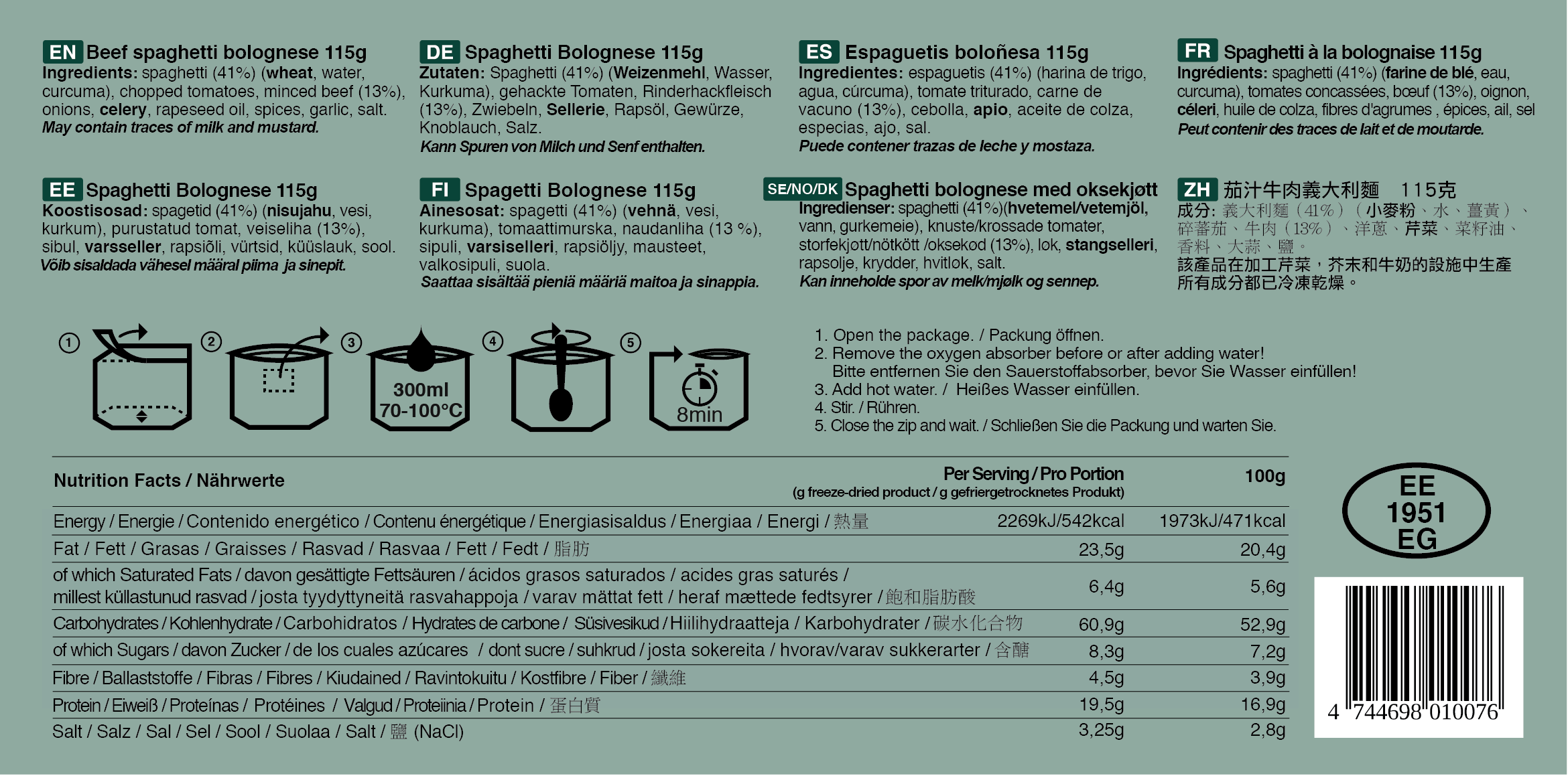 Με πολύ χαμηλό βάρος και υψηλή θερμιδική αξία, τα γεύματα αυτά προσφέρουν εξαιρετική ποιότητα γεύσης και ευνοούν την πέψη. Δεν περιέχουν συντηρητικά ή ενισχυτικά γεύσης χάρη στην προηγμένη τεχνολογία freeze dried, που διατηρεί τη θρεπτική αξία και την αυθεντικότητα των συστατικών.