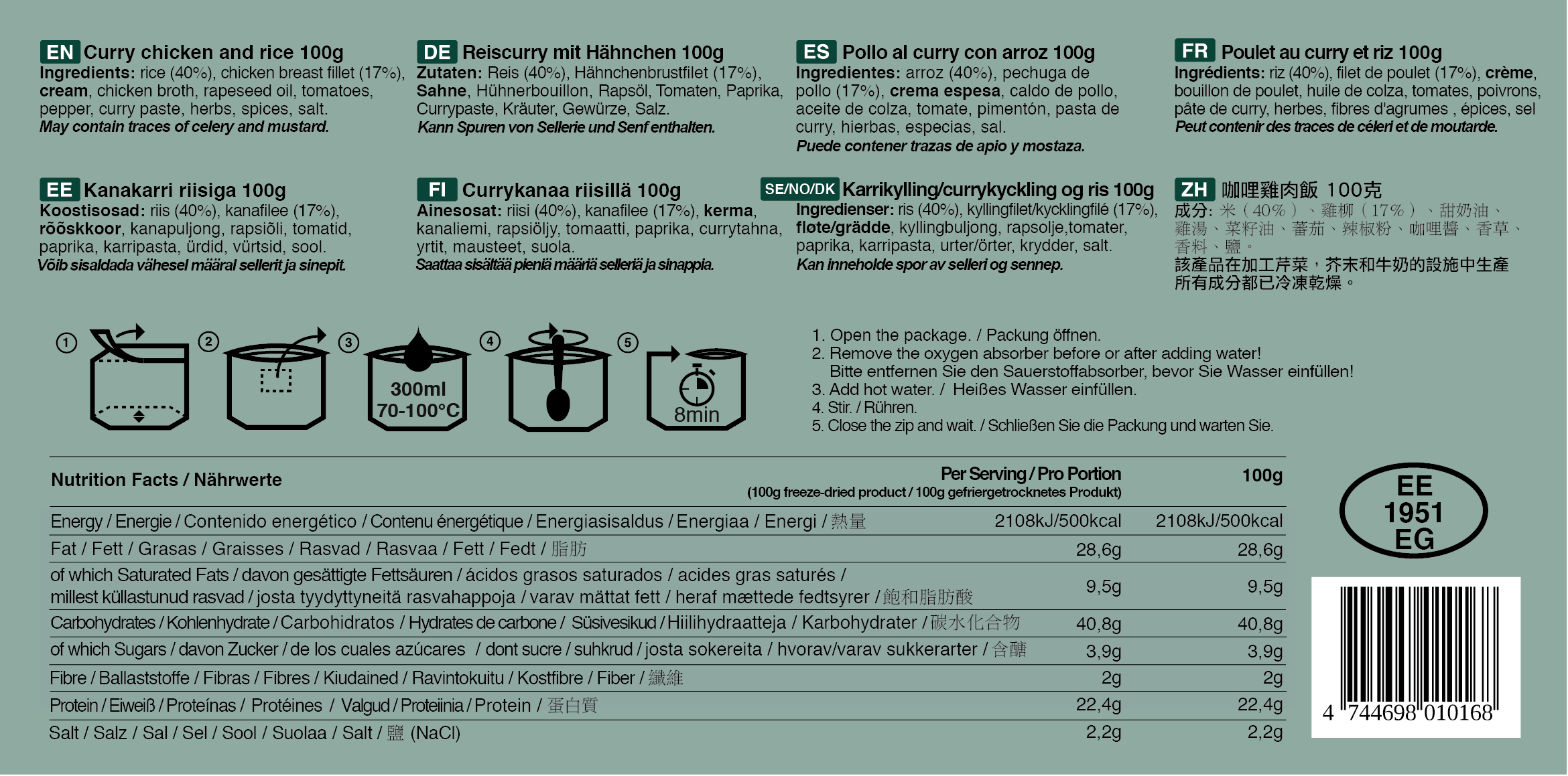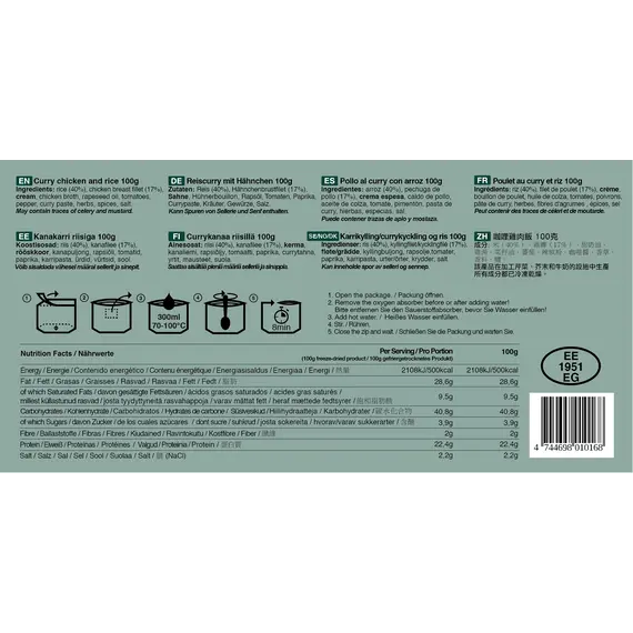 Με πολύ χαμηλό βάρος και υψηλή θερμιδική αξία, τα γεύματα αυτά προσφέρουν εξαιρετική ποιότητα γεύσης και ευνοούν την πέψη. Δεν περιέχουν συντηρητικά ή ενισχυτικά γεύσης χάρη στην προηγμένη τεχνολογία freeze dried, που διατηρεί τη θρεπτική αξία και την αυθεντικότητα των συστατικών.