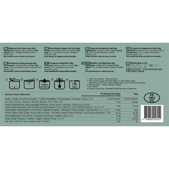 Η ανθεκτική και ελαφριά συσκευασία είναι σχεδιασμένη ώστε να μπορεί να χρησιμοποιηθεί και για την προετοιμασία του γεύματος. Χάρη στις συμπαγείς διαστάσεις, μεταφέρεται εύκολα σε σακίδιο ή ακόμη και σε τσέπες ρουχισμού χωρίς να επιβαρύνει τον χρήστη.
