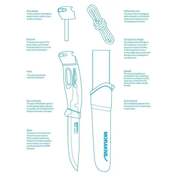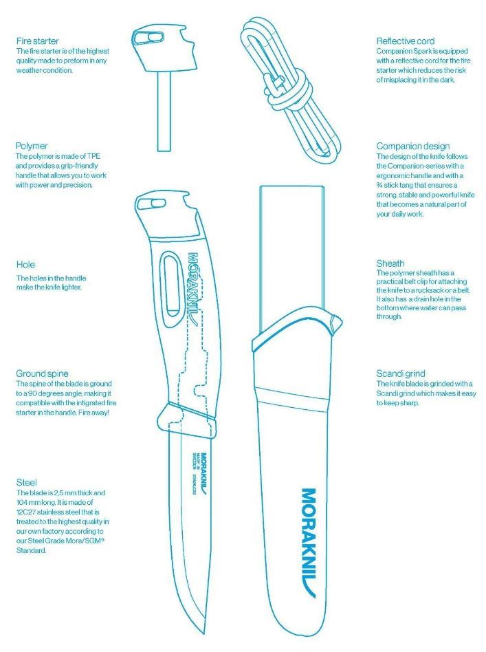 Βασισμένο στο δημοφιλές μοντέλο Companion, το νέο Companion Spark σχεδιάστηκε ως ένα αξιόπιστο εργαλείο κάτω από όλες τις καιρικές συνθήκες. Η ανθεκτική του λεπίδα είναι φτιαγμένη από σουηδικό ανοξείδωτο ατσάλι 2.5 χιλ. Διαθέτει μία μαλακή λαβή φτιαγμένη από λάστιχο TPE, το ποίο προσφέρει ασφαλή και σταθερή λαβή. Ο υψηλής ποιότητας σπινθηριστής κουμπώνει μέσα στη λαβή προσφέροντας εύκολη πρόσβαση και χρήση με τη λεπίδα του μαχαιριού. Επίσης, έχει ανακλαστικό κορδόνι για να εντοπίζεται εύκολα. Η θήκη του είναι φτιαγμένη από ανθεκτικό πολυμερές με κλιπ για εύκολη προσάρτηση σε ζώνη ή τσάντα.