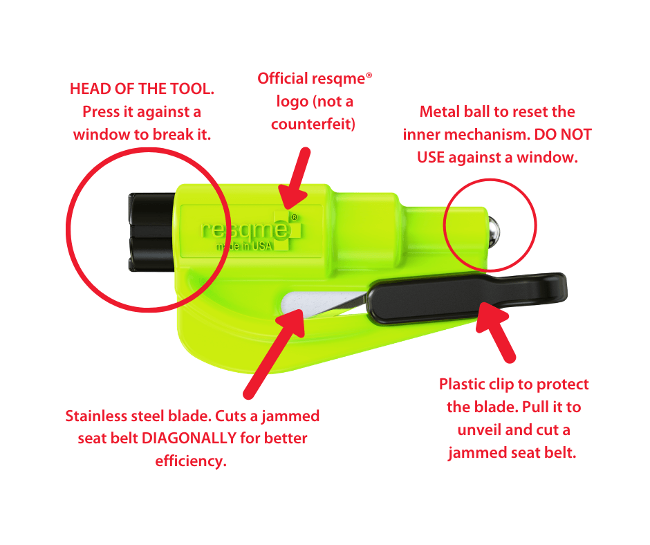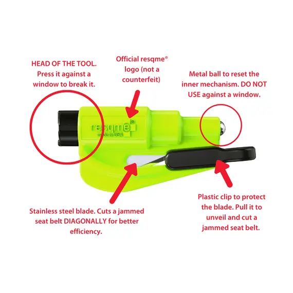 Το resqme μπορεί να κόψει μπλοκαρισμένες ζώνες ασφαλείας με την κοφτερή του λεπίδα και να σπάσει τα πλαϊνά τζάμια με την ακίδα του. Το RESQME είναι ένα εργαλείο που πρέπει να έχει ο κάθε οδηγός. Είναι ελαφρύ, μικρό αλλά πολύ χρήσιμο. Μπορείτε να το έχετε στα κλειδιά σας ή να το προσαρμόσετε σε κάποιο σημείο του αυτοκινήτου σας έτσι ώστε να είναι πάντα προσβάσιμο σε καταστάσεις έκτακτης ανάγκης.