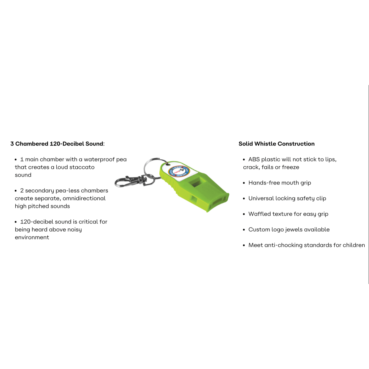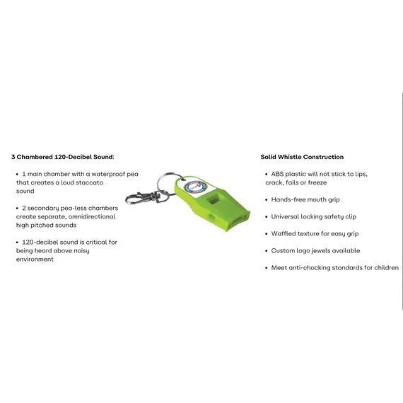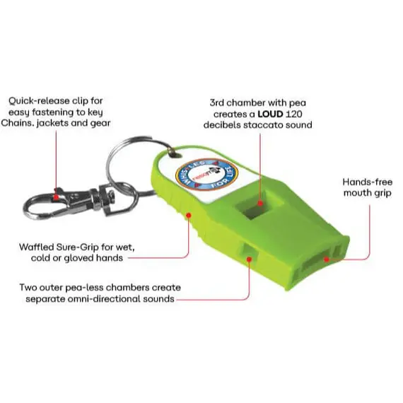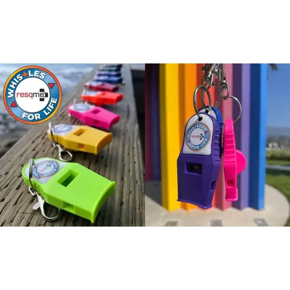 Σφυρίχτρα 120 decibels, κατασκευασμένη στις ΗΠΑ από ισχυρό πλαστικό ABS. Η Σφυρίχτρα της Resqme είναι αδιάβροχη και έχει υποστεί ειδική επεξεργασία για να μη φθείρεται από τις υπεριώδεις ακτίνες του ηλίου. Παράγει ήχο πολλαπλών κατευθύνσεων από τους 3 θαλάμους που διαθέτει. Έχει κατασκευαστεί για να μπορεί να συγκρατείται με τα δόντια χωρίς να χρειάζεται να την κρατάτε με το χέρι σας στο στόμα σας. Σφυρίχτρα της Resqme είναι ιδανική για καταστάσεις έκτακτης ανάγκης, αν ακουστείτε μπορεί να διασωθείτε.