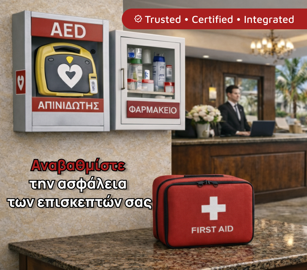 | Η ασφάλεια των επισκεπτών δεν αποτελεί πλέον μόνο νομική υποχρέωση της επιχείρησης. Αποτελεί ένδειξη ποιοτικής φιλοξενίας και παροχών ασφαλείας αναβαθμίζοντας την επιχείρησή σας. Με τις πρόσφατες εξελίξεις στο ρυθμιστικό πλαίσιο και την αυστηροποίηση των προτύπων ασφάλειας στους χώρους φιλοξενίας, η παρουσία εξοπλισμού Πρώτων Βοηθειών και Αυτόματου Εξωτερικού Απινιδωτή (AED) καθίσταται πιο επίκαιρη από ποτέ. Η έγκαιρη αντιμετώπιση μιας καρδιακής ανακοπής στα πρώτα 3-5 λεπτά μπορεί να αυξήσει θεαματικά τις πιθανότητες επιβίωσης. Η πρόληψη δεν αποτελεί κόστος. Αποτελεί επένδυση ζωής. Προστατέψτε λοιπόν κάθε καρδιακό παλμό! |